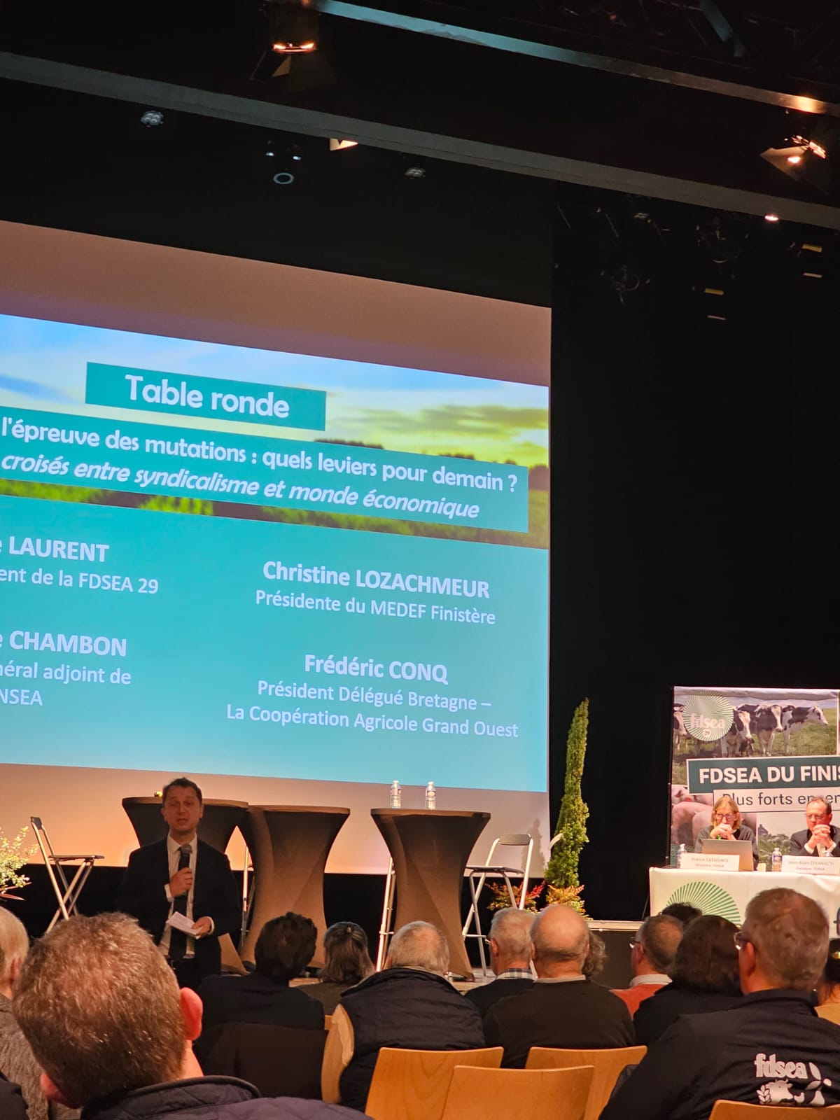 Jeudi 29 janvier c’était l’AG 2026 de la FDSEA du Finistère à Pleyben, en présence de son Président Jean-Alain Divanac’h, du Secrétaire Général Adjoint de la FNSEA Christophe Chambon, de la Présidente du MEDEF Finistère Christine Lozachmeur, de Philippe Laurent, 2e vice-président de la FDSEA, et enfin du Président Délégué Bretagne de la Coopération Agricole Grand Ouest Frédéric Conq et en présence des Jeunes Agriculteurs du Finistère, de Michel Canevet, Maël de Calan et Graziella Melchior.